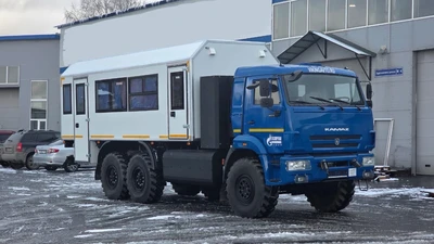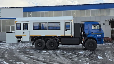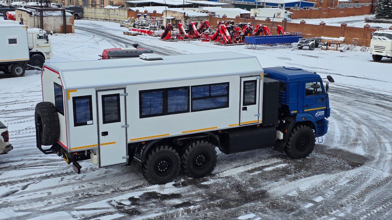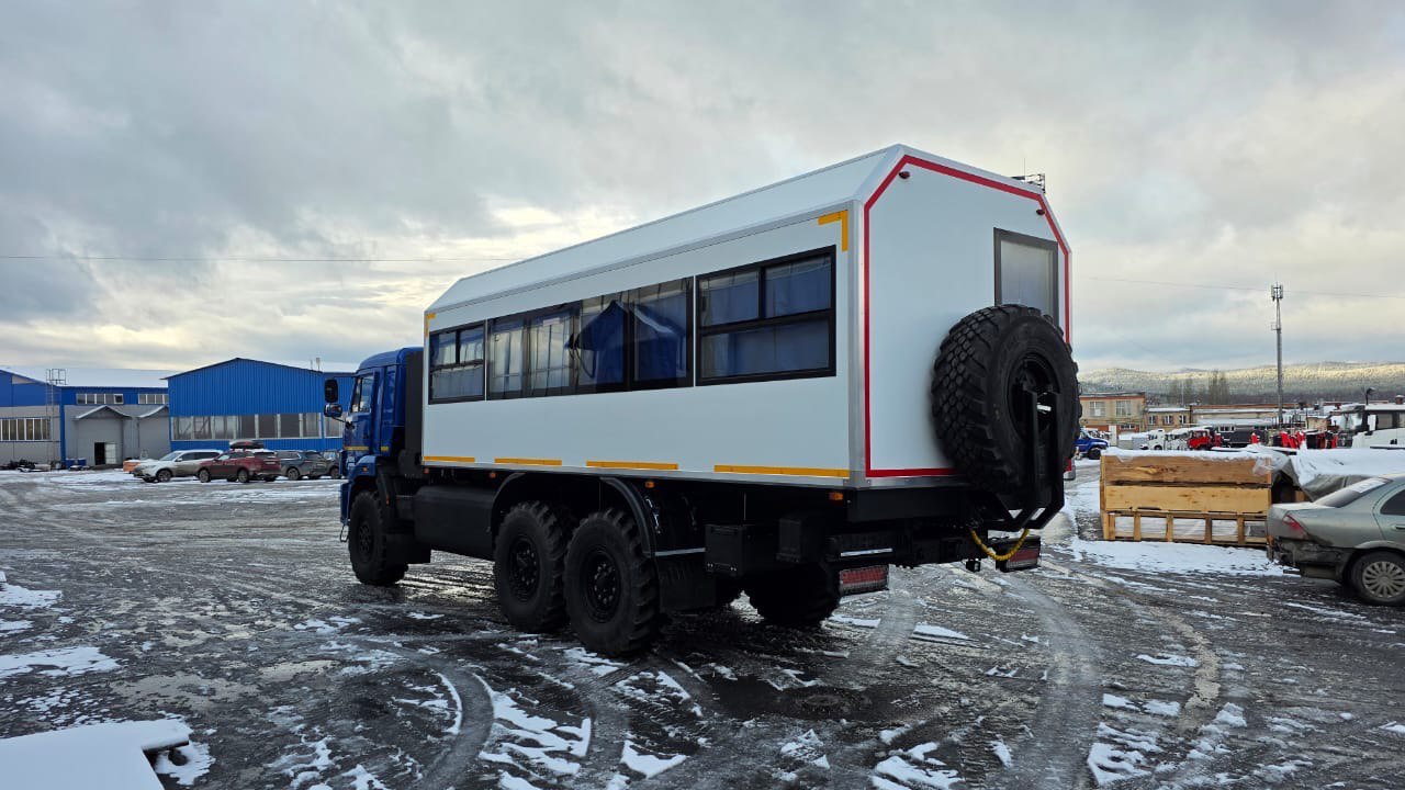 Кузов-фургон представляет собой конструкцию с боковыми скосами из пятислойных «сэндвич-панелей», с обоих сторон обшит плакированным листом между которыми находится теплоизоляция и фанера для усиления конструкции, пол – автолин, две входные боковые двери с окном, замком, козырьком, подсветкой. Внутри вахтового автобуса установлены: 26 сдвоенных сидений из кожзама, двойное остекление с шторками, аудиосистема с монитором, видеонаблюдение, откидная лестница, перегородка с поручнем, шторки на окнах, плафоны освещения, стол, аварийно-вентиляционный люк, ящик для запчастей и принадлежностей, переговорное устройство (фургон/кабина), аптечка, огнетушители, 3 отопителя.